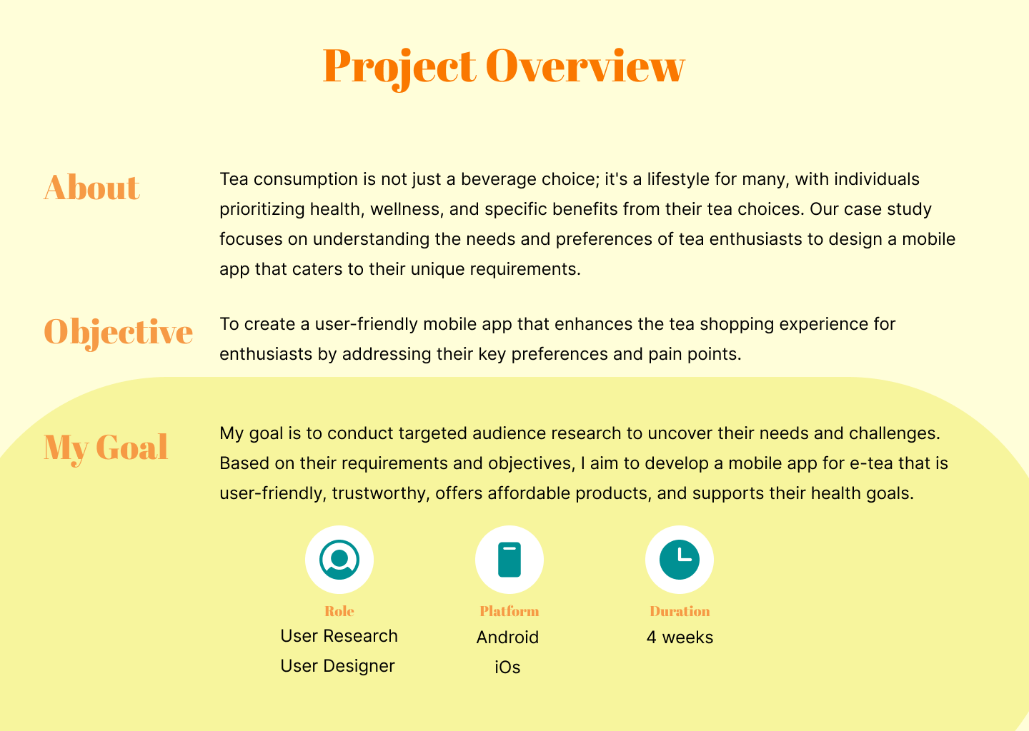 My goal for this case study is to conduct targeted audience research to uncover their needs and challenges. Based on their requirements and objectives, I developed a mobile app for e-tea that is user-friendly, trustworthy, offers affordable products, and supports their health goals.